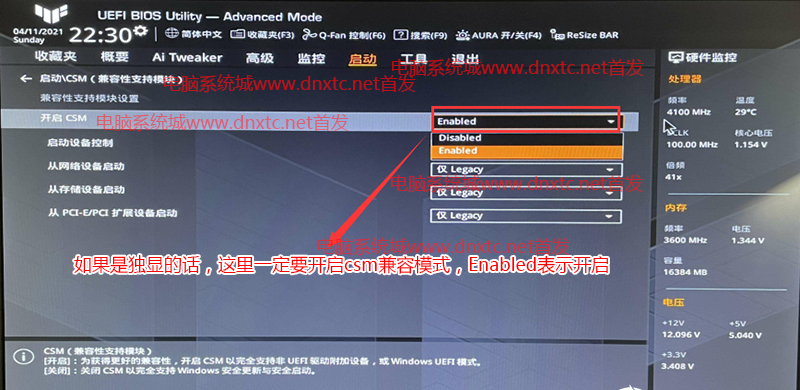 4、再返回到”启动”的选项,选择CSM(兼容性支持模式),将CSM由disabled改成enabled表示开启兼容模式(注意这里独显一定要开启CSM兼容模式),如下图;