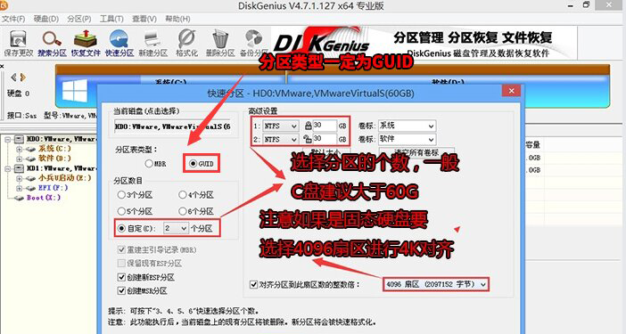 3、在弹出的【快速分区】界面,我们这里选择好分区的类型GUID、分区的个数、分区大小,这里一般推荐C盘大小大于60G以上比较好,然后注意如果是固态硬盘要进行4K对齐,然后确定就可以开始分区了,如下图;