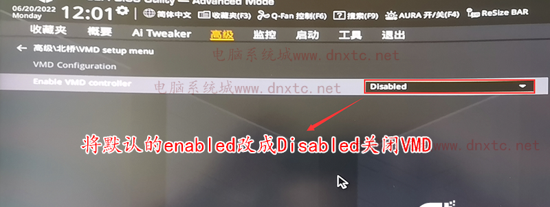 按键盘上→方向键移动到高级,找到北桥中VMD setup menu,将enabled VMD controller中默认的enabled改成disabled表示关闭vmd,安装win7一定要关闭vmd,默认win7没有vmd驱动,如下图;