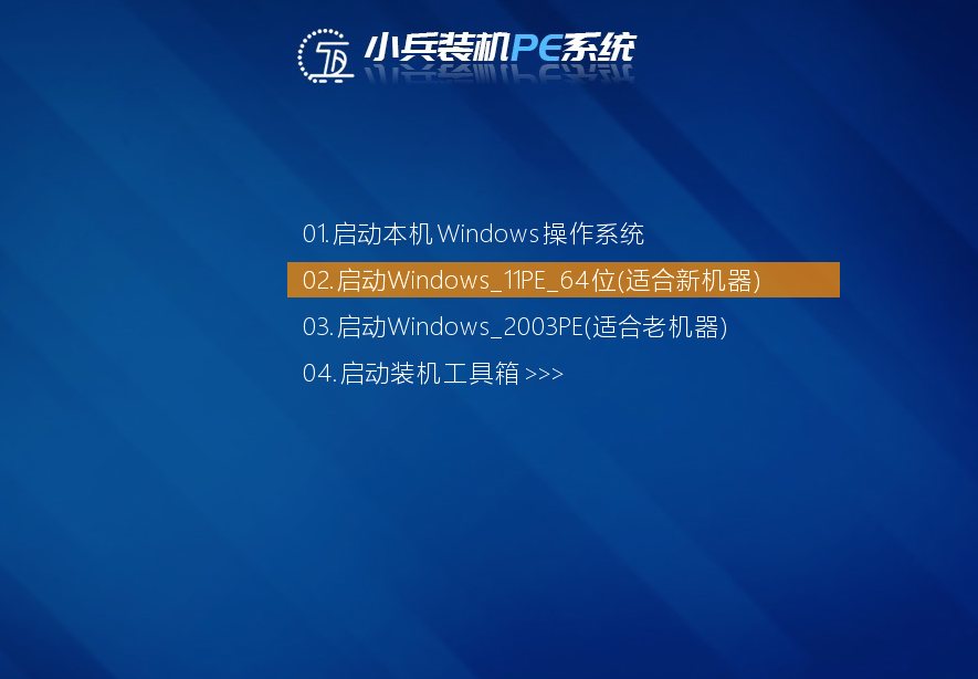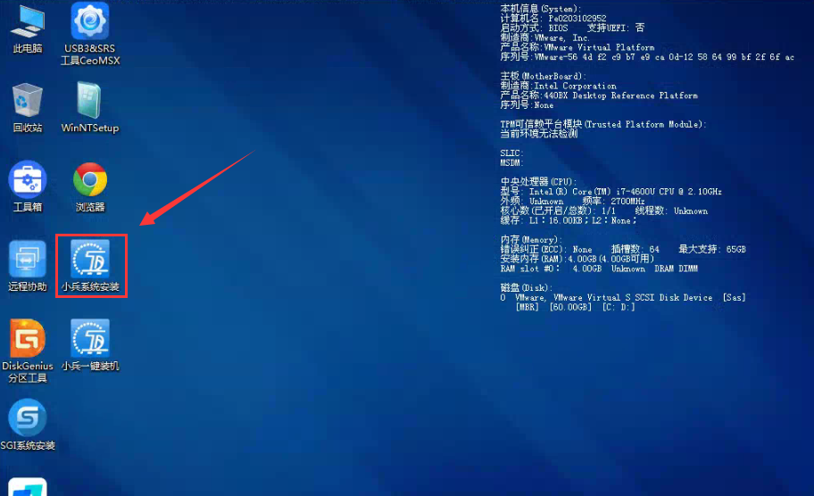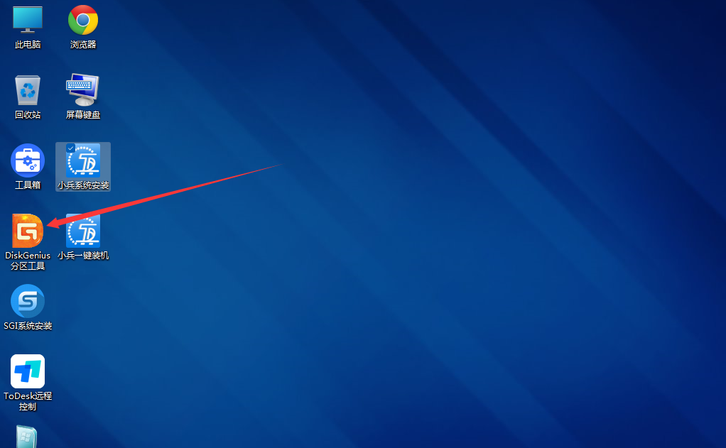 1、通过快捷方式或设置u盘为第一启动后,然后选择U盘启动盘进入小兵PE后,选择启动windows_11PE_64位进入pe(MBR方式启动时有菜单选择,uefi方式启动时自动进入win11pe),在桌面上运行DiskGenius分区工具,如下图;