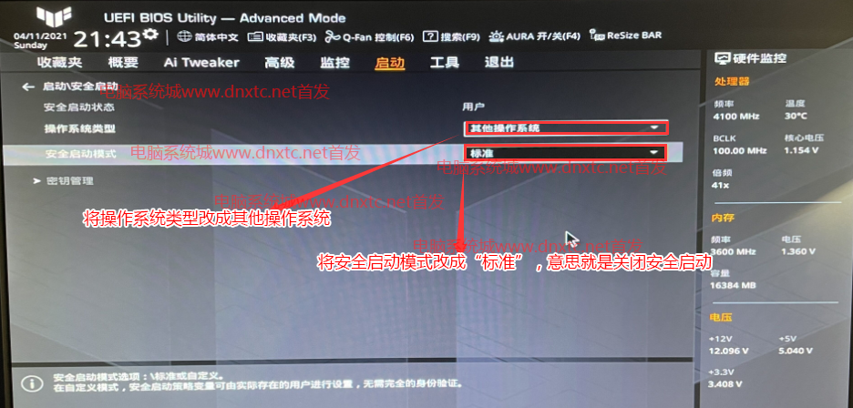 3、接着按键盘上的→方向键移动到”启动”选项,选择安全启动菜单,然后回车进入将安全启动模式改成”标准”(代表关闭安全启动),再将操作系统类型改成”其他操作系统”,如下图;