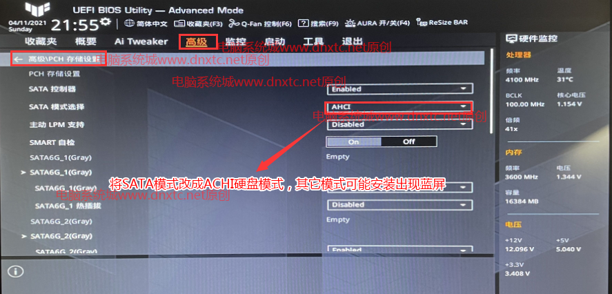 排查一:如果蓝屏代码为0x0000007b,话检查bios中的硬盘模式是否更改为ahci,vmd选项是否关闭。默认情况win7不支持raid、vmd、rst等模式安装win7,需要将硬盘模式更改为ahci。