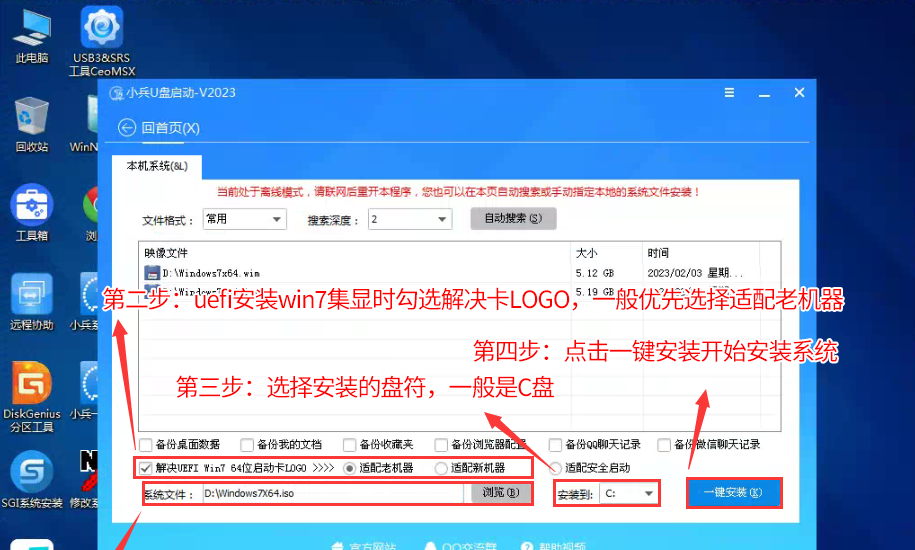 2、选择下载的WIN7(建议采用本站的WIN7自带usb驱动、显卡、nvme驱动)及要安装的盘符,一般情况是C盘(根据不同的硬盘分区),(注意:如果是独立显卡,这里直接不用勾选卡LOGO选项,只需要开启CSM直接安装即可。采用独立显卡时当bios中无法开启CSM兼容模式出现安装win7卡lgoo的情况才勾选“解决UEFI WIN7 64位卡LOGO”选项,如果没出现不建议勾选,另外注意勾选后可根据实际情况选择适配老机器或适配新机器,建议华硕b560主板选择适配老机型,反之选择适配新机型,如果其中一种方式不行可选择另一个方案),然后点击一键安装,如图所示: