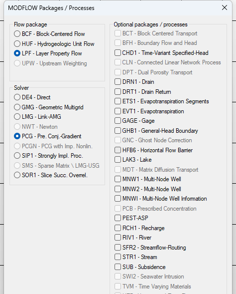 MODFLOW Packages / Processes: 表明这是用于选择 MODFLOW 模型中使用的包和求解器的窗口。