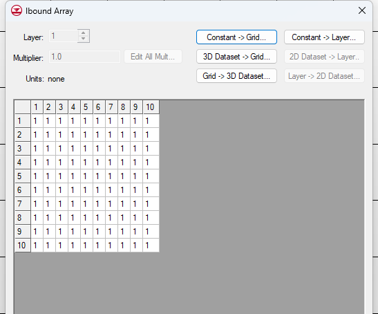 IBOUND… (IBOUND…): 点击此按钮将打开一个对话框,用于定义模型的边界条件类型。IBOUND 数组用于指定模型区域的活动单元、固定水头单元和非活动单元。