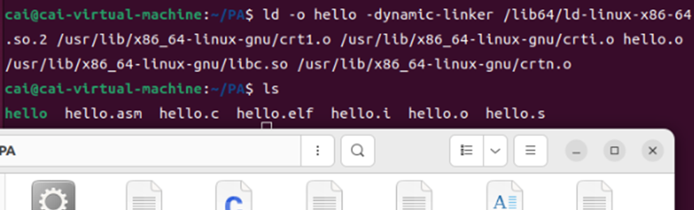 任务:合并hello.o与共享库(如libc.so),解析外部符号(如printf),分配虚拟地址空间,生成可执行文件hello。