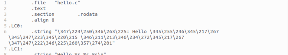 编译(Compilation):将hello.i转换为汇编代码hello.s,完成语法语义分析并生成机器无关的低级表示。