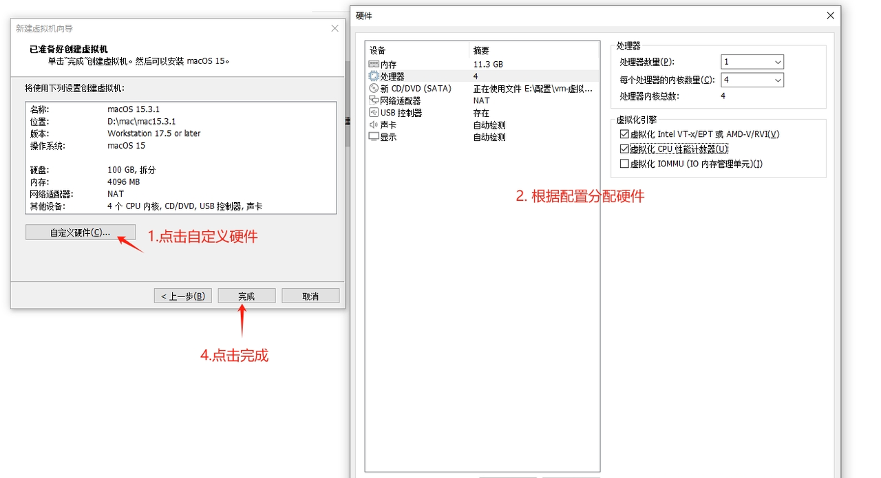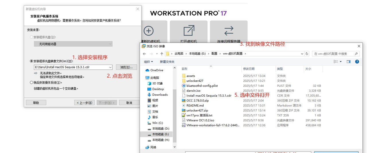 文件名称 描述 VMware-workstation-full-17.6.2-24409262.exe 安装vm虚拟机 vm17pro 激活码.txt 用于激活vm unlocker427.zip 让vm支持安装mac苹果系统补丁 VMware OC1.0.2.iso 添加OC引导 OCC 2.78.0.0.zip OpenCore Configurator工具用于编辑OC config darwin.iso 用于主机向mac系统拷贝文件