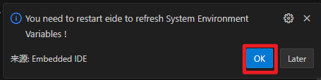 以上的工具都安装完毕之后点击右下角的OK重启EIDE(或者手动重启VS Code)(这些工具的安装位置在:C:Users你的用户名.eide ools):