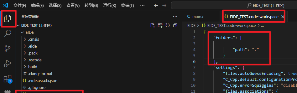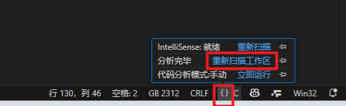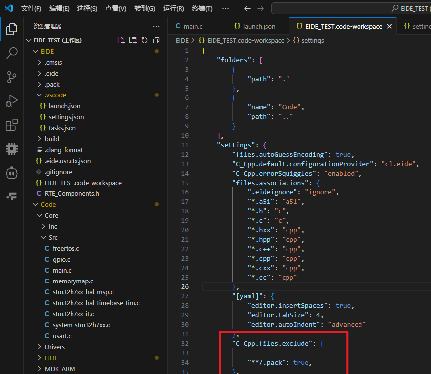 在我红框框选的地方加入代码,“C_Cpp.files.exclude” 方式配置了需要IntelliSense忽略的文件目录,我们把芯片支持包的目录添加进去然后你可以进入任何一个.c文件选择在右下角点击重新分析工作区,也可以重启VS Code: