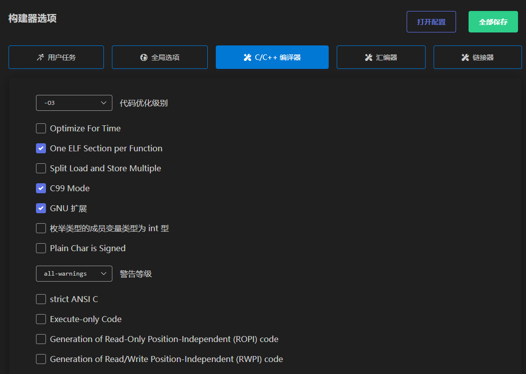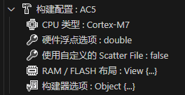 构建配置中有五个子项:其中CPU类型和硬件浮点选项只要安装了芯片支持包是自动给你配置的。