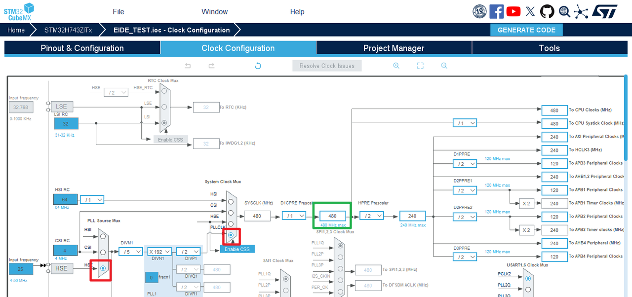 7.时钟树配置:两个红框选择完之后,在绿框位置输入480然后按下回车自动设置时钟树