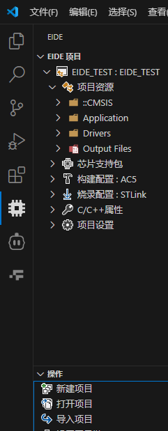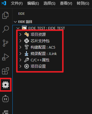我们导入完工程之后,点击EIDE的插件图标会发现有六个功能模块,分别是:项目资源、芯片支持包、构建配置、烧录配置、C/C++属性以及项目设置(由于篇幅,我在这里只能简单介绍,如果有疏漏请参考官方教程)