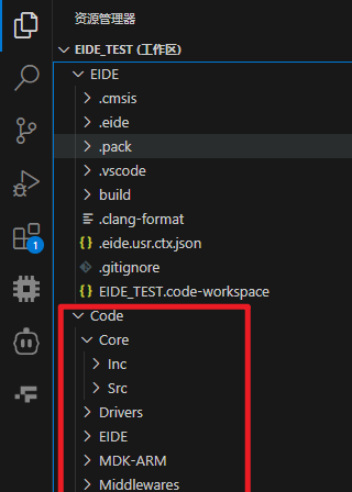 – 这段代码在folders中添加了一项,目的是让智能提示和跳转功能(C/C++插件的IntelliSense功能)能够识别到咱们的项目工程文件,其中的内容和咱们刚才为EIDE创建的文件夹的位置有关,我刚才把EIDE文件夹创建到项目根文件夹下面,那么其中path的内容就应该是“..”,这代表将根文件夹(EIDE文件夹的上级目录)添加到工作区,然后给根文件夹起一个名字,我这里就叫做“Code”,大家想叫啥都可以