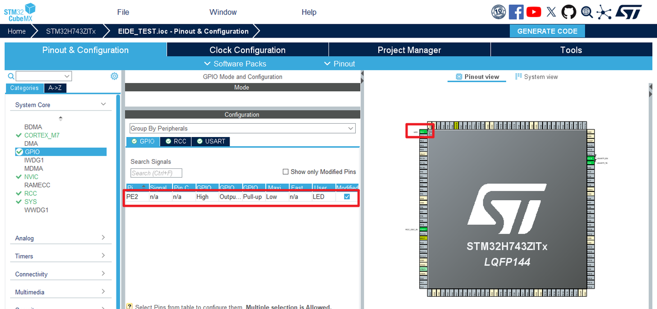 3.GPIO设置:因为本工程只是一个演示工程,所以只初始化了一个LED灯