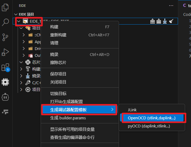1.在项目名称右键,点击生成调试器配置模板,选择对应的调试器,我用的stlink所以选择OpenOCD: