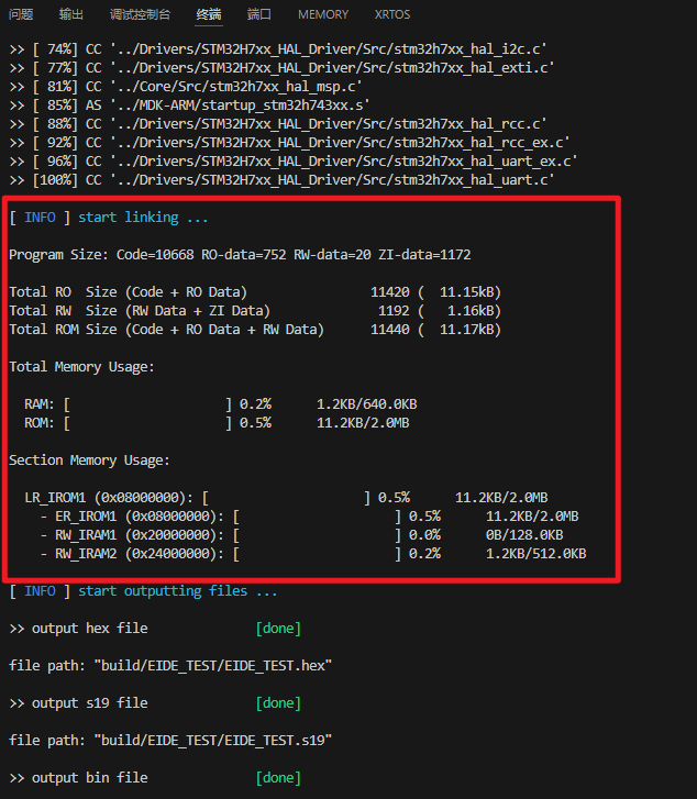 可以看到,EIDE除了显示了编译之后的代码大小,还给出了内存和Flash的使用情况,甚至根据sct文件显示出了每个内存区的使用占比(就问苦苦查map文件的同学,这不比Keil香?)