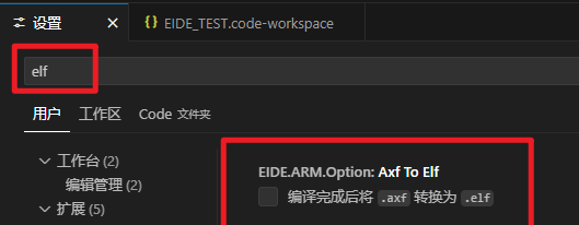 – 然后按Ctrl+,打开VS Code设置,搜索elf:将下面框选的设置勾选,这是为了让编译器在编译结束后将axf文件转换成elf文件供咱们调试使用。