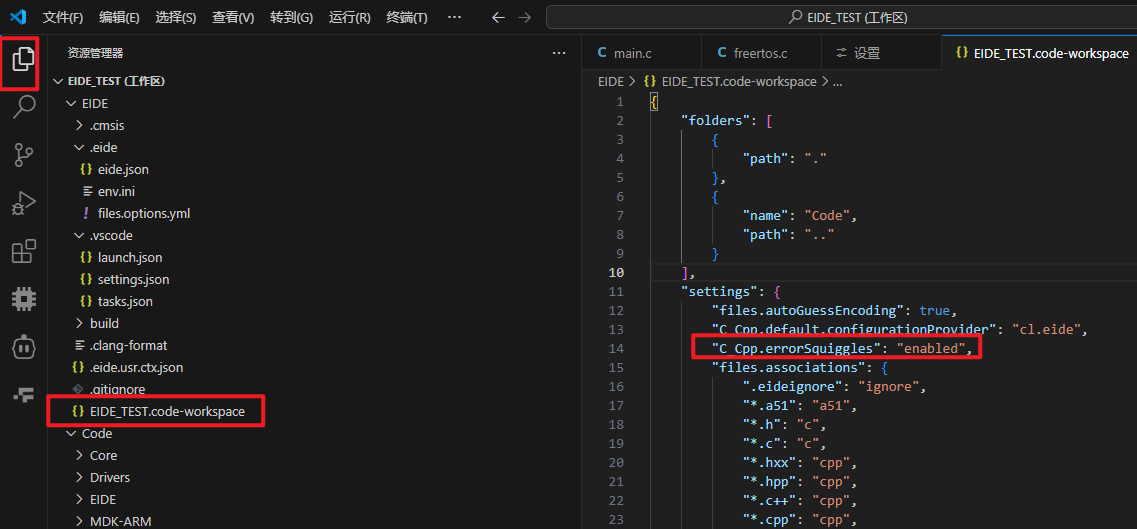 把工作区文件中的“settings”中的“C_Cpp.errorSquiggles”项设置成“enabled”