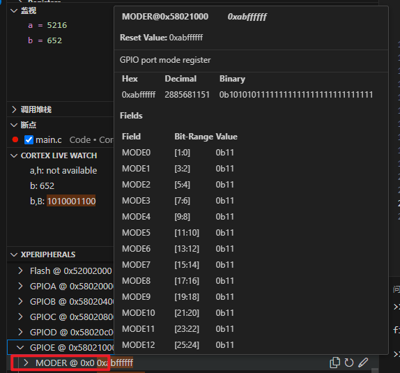 5.这个区域用来显示外设寄存器的值:你将鼠标悬停在对应的寄存器值上会显示出详细的信息,如下图: