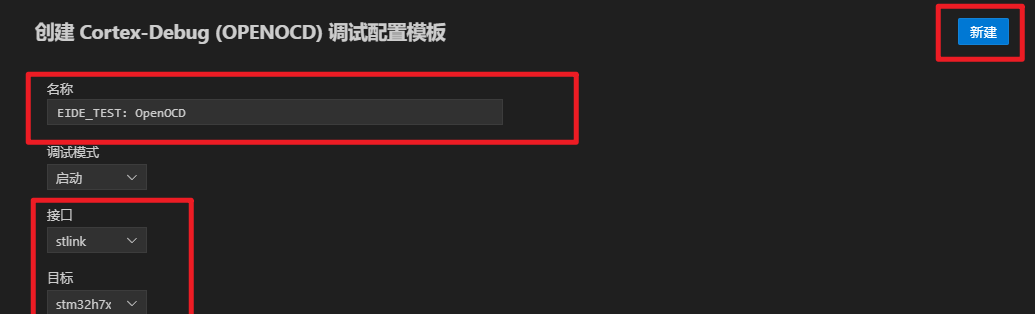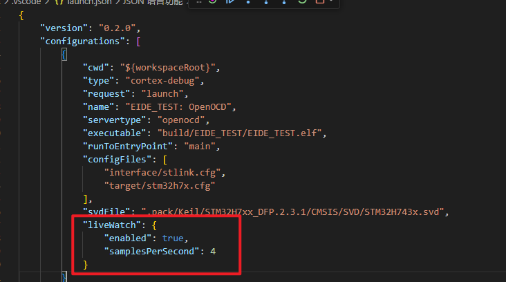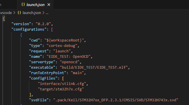 配置完毕之后点击新建,发现跳转到了launch.json文件(该文件在 EIDE文件夹.vscode)中,其中的配置EIDE已经帮咱们配置好了,下面给大家介绍一下每一个配置项(其他调试器的配置项也是大同小异,基本不需要做改动),如有遗漏,或需要高级操作,请参考CortexDebug的官方WiKi。