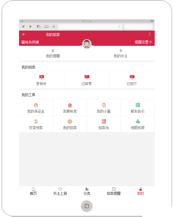 手机APP物品拍卖个人中心页面模板,我的拍卖:参拍中、已结束、已拍下。我的工具:我的保证金、我要转卖、我的小蜜、爱车估价、变卖预款、我的拍卖、拍卖场、地图找房等页面模块。 © 版权声明文章版权归作者所有,未经允许请勿转载。如内容涉嫌侵权,请在本页底部进入<联系我们>进行举报投诉!THE END资源下载 如果内容对您有所帮助,就支持一下吧!点赞7 分享QQ空间微博QQ好友海报分享复制链接收藏