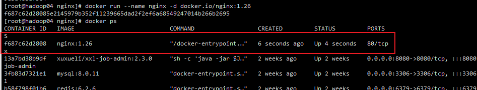 [root@192 nginx]# docker run --name nginx -d docker.io/nginx:1.26