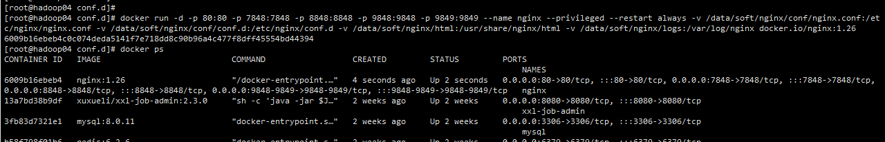 docker run -d -p 80:80 -p 7848:7848 -p 8848:8848 -p 9848:9848 -p 9849:9849 --name nginx --privileged --restart always -v /data/soft/nginx/conf/nginx.conf:/etc/nginx/nginx.conf -v /data/soft/nginx/conf/conf.d:/etc/nginx/conf.d -v /data/soft/nginx/html:/usr/share/nginx/html -v /data/soft/nginx/logs:/var/log/nginx docker.io/nginx:1.26