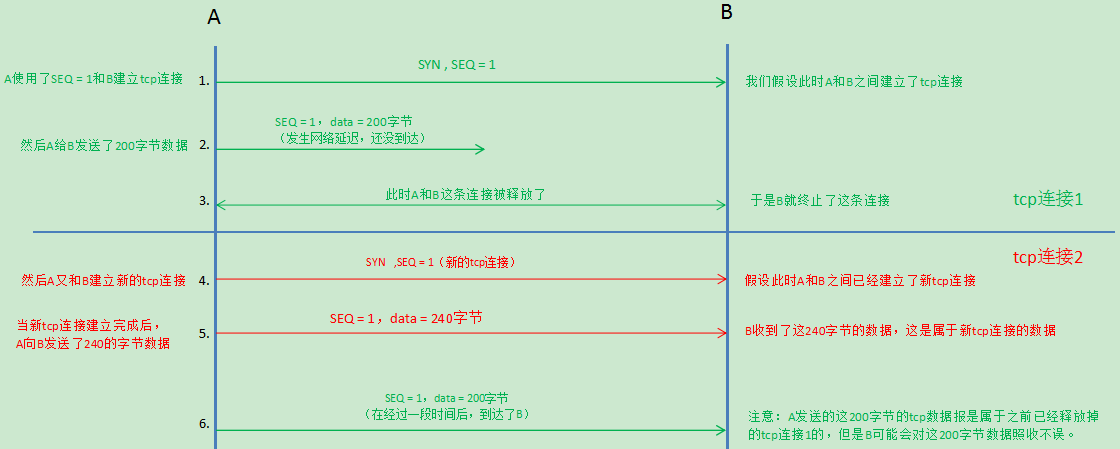 5.A之前发送的TCP数据报经过一段时间后终于到达B,不过该TCP数据报属于之前已经释放的旧TCP连接,B应该把这个数据报丢弃掉,但是由于A每次发送报文都使用了相同的序号(seq = 1)从而会让B误认为该数据报属于新建立的TCP连接,因此B会对该数据照收不误导致B在收到新TCP连接的数据后又收到旧TCP连接的数据从而出现数据乱序的问题3.