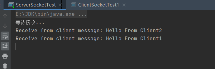 package com.socket; import java.io.InputStreamReader; import java.io.Reader; import java.net.ServerSocket; import java.net.Socket; public class ServerSocketTest { public static void main(String[] args) { int port = 8919; try { ServerSocket server = new ServerSocket(port); System.out.println("等待接收..."); while (true) { Socket socket = server.accept(); Reader reader = new InputStreamReader(socket.getInputStream()); char chars[] = new char[1024]; int len; StringBuilder builder = new StringBuilder(); while ((len=reader.read(chars)) != -1) { builder.append(new String(chars, 0, len)); } System.out.println("Receive from client message: " + builder); } // reader.close(); // socket.close(); // server.close(); } catch (Exception e) { e.printStackTrace(); } } }package com.socket; import java.io.IOException; import java.io.OutputStreamWriter; import java.io.Writer; import java.net.Socket; public class ClientSocketTest1 { public static void main(String[] args) { String host = "127.0.0.1"; int port = 8919; try { Socket client = new Socket(host, port); Writer writer = new OutputStreamWriter(client.getOutputStream()); writer.write("Hello From Client1"); writer.flush(); writer.close(); client.close(); System.out.println("发送成功!"); } catch (IOException e) { e.printStackTrace(); } } }package com.socket; import java.io.*; import java.net.Socket; public class ClientSocketTest2 { public static void main(String[] args) { String host = "127.0.0.1"; int port = 8919; try { Socket client = new Socket(host, port); Writer writer = new OutputStreamWriter(client.getOutputStream()); writer.write("Hello From Client2"); writer.flush(); writer.close(); client.close(); System.out.println("发送成功!"); } catch (IOException e) { e.printStackTrace(); } } }