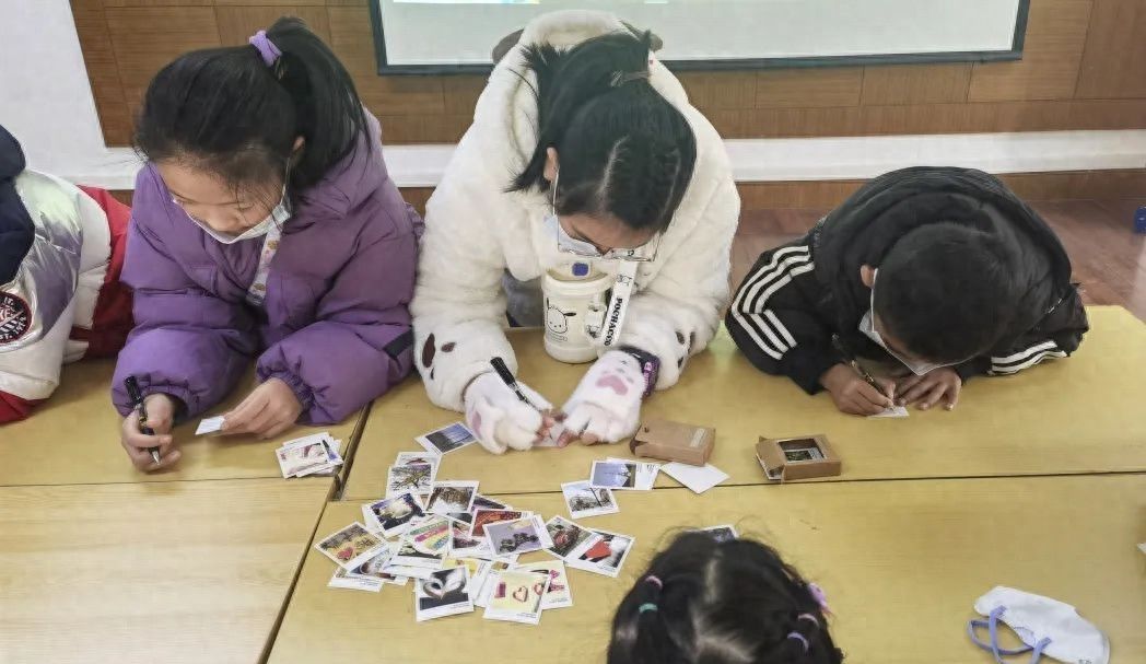 活动伊始,孩子们先在社工的引导下完成了心愿卡片制作。大家在心愿卡上“唰唰”动笔,写下了对即将竣工的小书箱的新年期许——“希望我的朋友们也能来小书箱里玩”“愿大家都能爱护地球”“不要随地乱吐口香糖”……孩子们的眼神专注而认真,稚嫩的笔迹里,却满是经过深思熟虑、沉甸甸的祝福,每一个笔画中都充满真诚与憧憬。