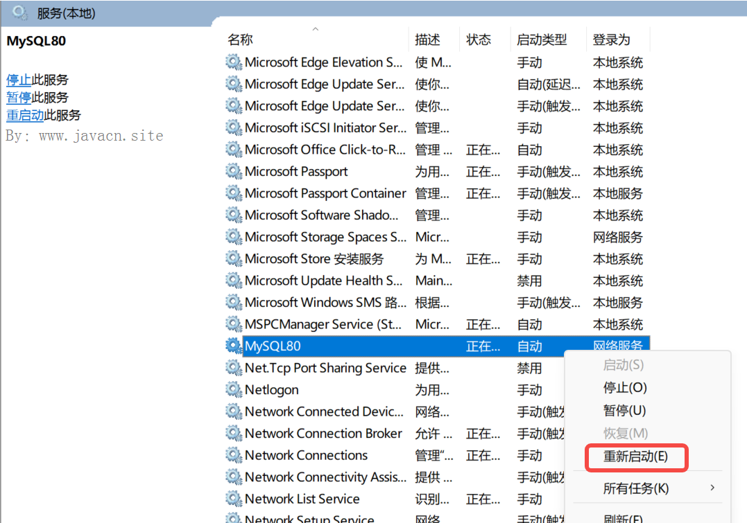 Windows 平台找到服务列表中的 MySQL 服务重启即可,如下图所示: