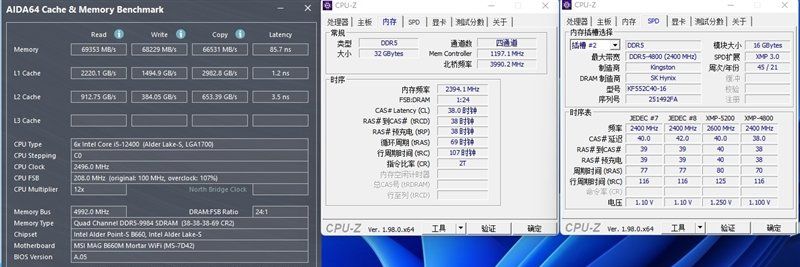 开启XPG 4800MHz 38-38-38-70时,内存的读取、写入和复制带宽分别为69353MB/s、68229MB/S、66531MB/s,而内存的延迟则为85.7ns。