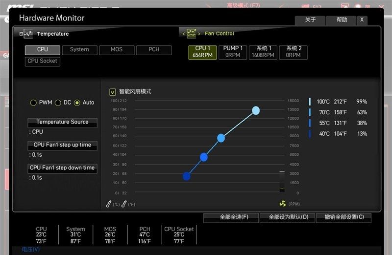 在主界面点击“风扇信息”进入风扇设置页面之后,我们可以看到一共有主板一共设计了2个4Pin CPU风扇、2个4Pin机箱风扇接口。4个风扇都可以单独依据CPU、MOS、主板或者机箱内部温度来设置温度曲线。