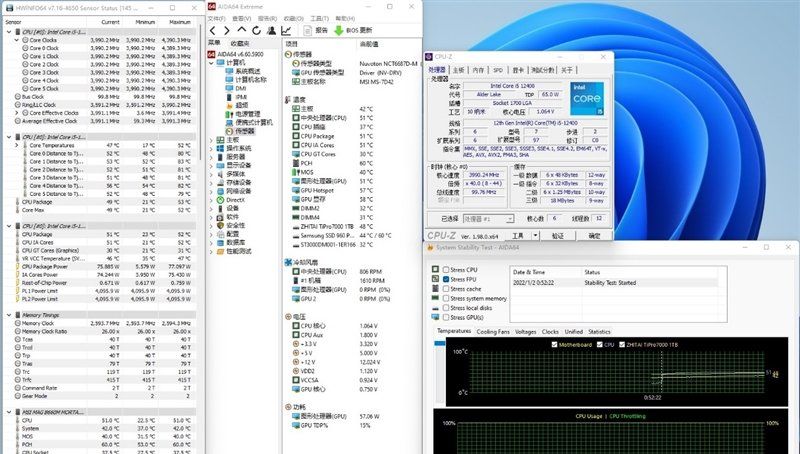 使用AIDA64 FPU进行烤机,9分钟之后,处理器的电压为1.064V,全核频率4.0GHz,功耗75W,温度仅有51度。