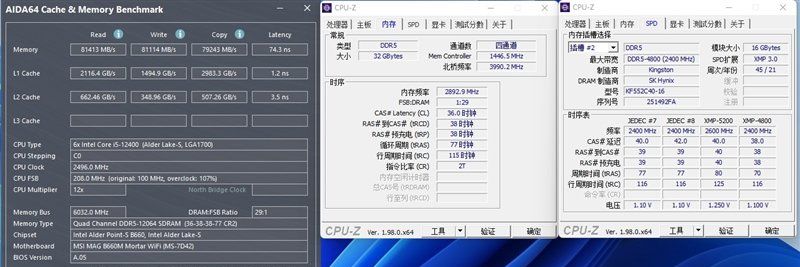 实测内存读取、写入与复制带宽分别为81413MB/s、81114MB/s、79243MB/s,但是延迟大幅度降到了74.3ns,比4800MHz C38时降到了整整11.4ns之多。