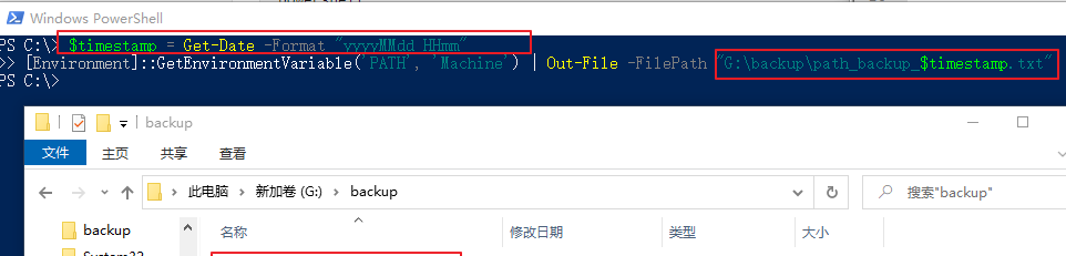 [Environment]::GetEnvironmentVariable('PATH', 'Machine') | Out-File -FilePath "G:ackuppath_backup_$timestamp.txt"