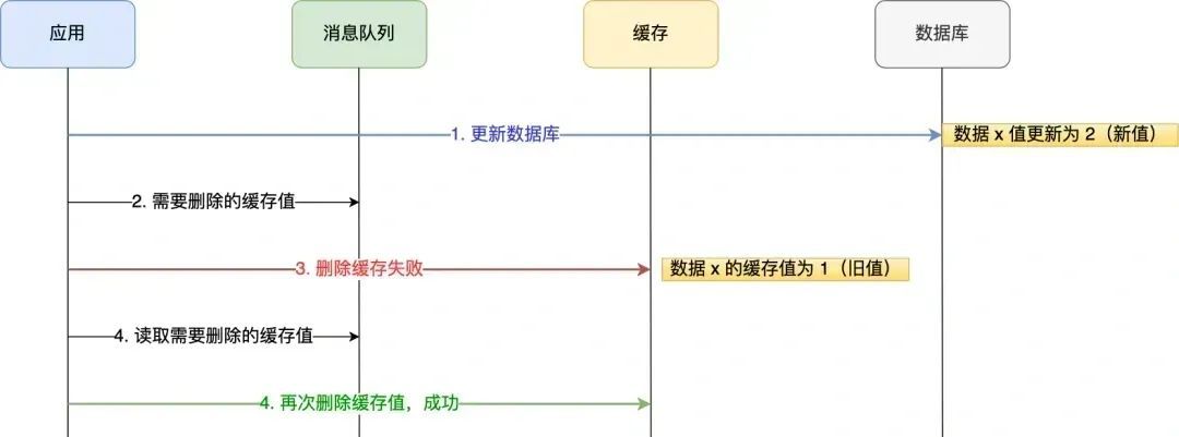 如果应用删除缓存失败,可以从消息队列中重新读取数据,然后再次删除缓存,这个就是重试机制。当然,如果重试超过的一定次数,还是没有成功,我们就需要向业务层发送报错信息了。