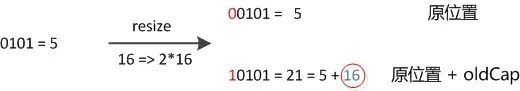 因此元素在重新计算hash之后,因为n变为2倍,那么n-1的mask范围在高位多1bit(红色),因此新的index就会发生这样的变化: