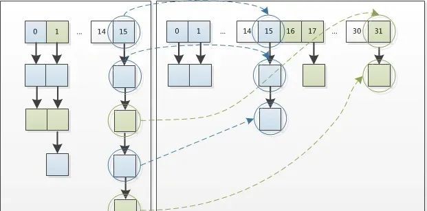 因此,我们在扩充HashMap的时候,不需要重新计算hash,只需要看看原来的hash值新增的那个bit是1还是0就好了,是0的话索引没变,是1的话索引变成“原索引+oldCap”。可以看看下图为16扩充为32的resize示意图: