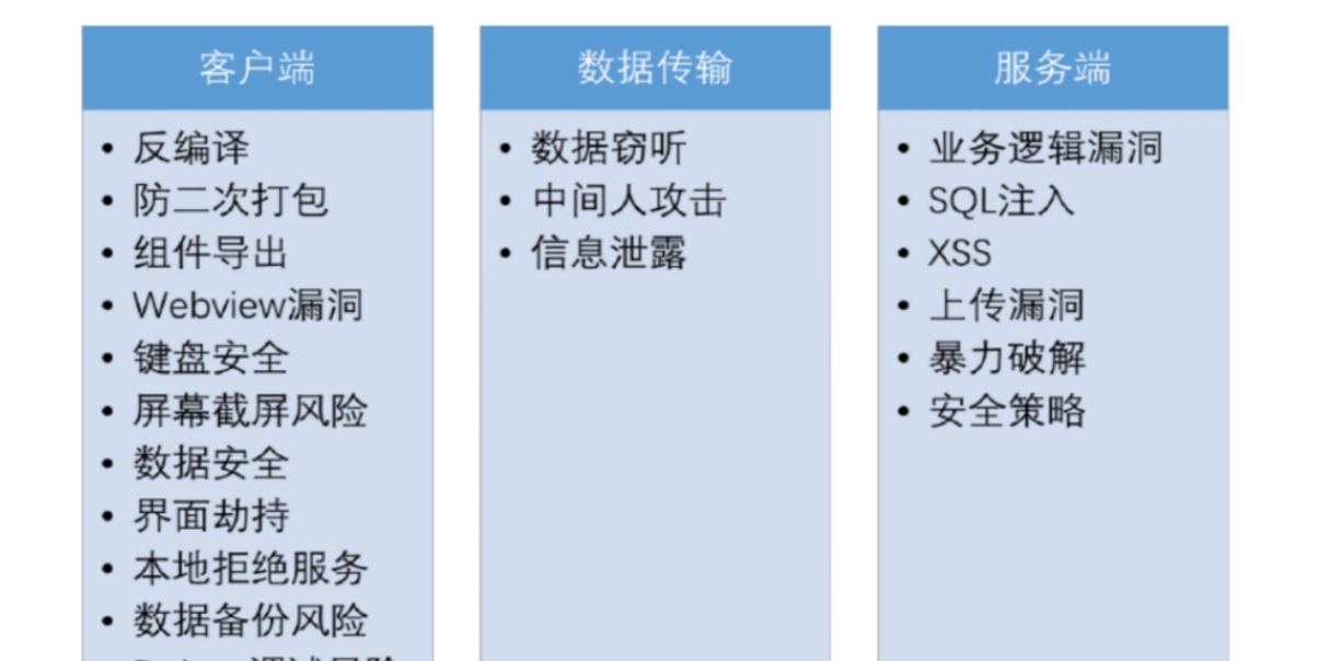 安全威胁从三个不同环节进行划分,主要分为客户端威胁、数据传输端威胁和服务端的威胁。