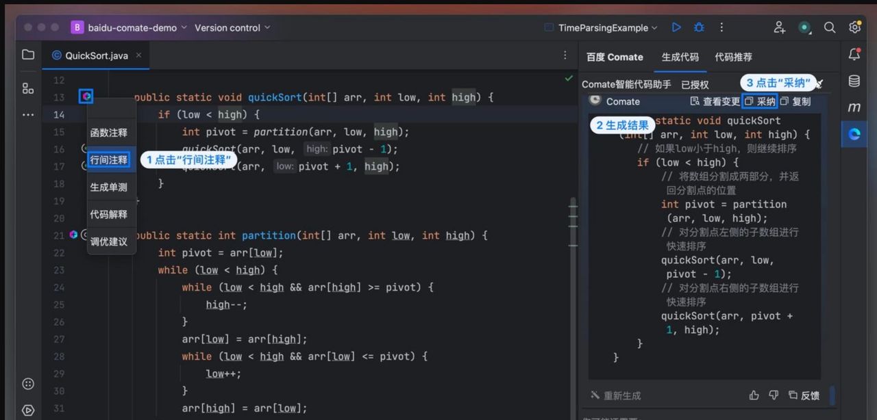 生成文档注释:点击函数(方法)名前方的 文心快码 (Baidu Comate) 图标,选择“函数注释”,等待结果返回,点击“采纳”,将注释内容插入函数(方法)头部。也可以选中需要注释的代码,在文心快码 (Baidu Comate) 面板底部选择“为选中的代码生成注释”实现相同的功能。