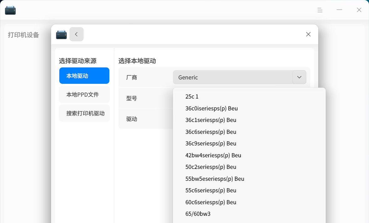 驱动:选择匹配的驱动版本(示例中为 Generic 36C-6SeriesPS(P) BEU v1.6)。