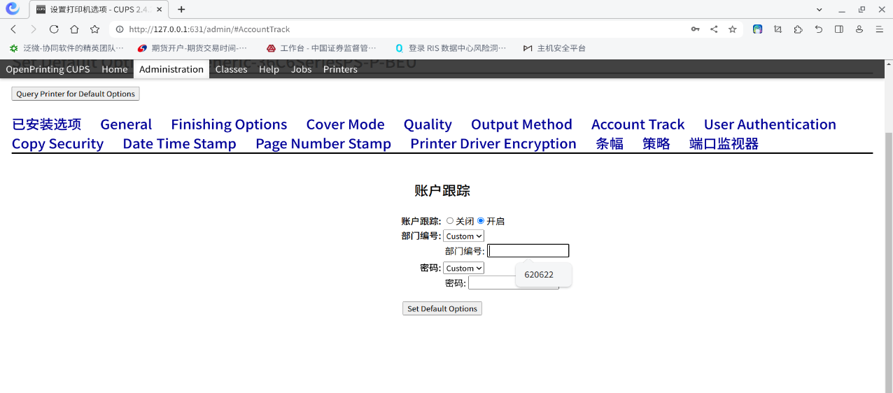 输入部门编号和密码(示例密码为 620622),点击 “Set Default Options” 保存配置。