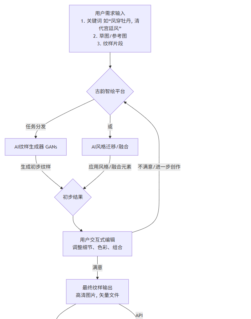 AI核心引擎:平台的大脑,包括存储纹样数据的数据库、用于理解纹样的特征提取模块、负责创新的GANs生成器和风格迁移模块,以及协调各项任务的管理模块。