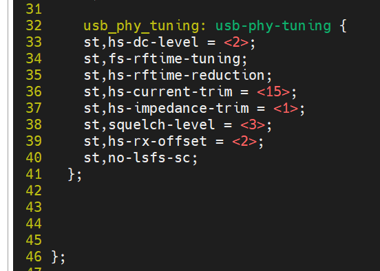 usb_phy_tuning: usb-phy-tuning { st,hs-dc-level = <2>; st,fs-rftime-tuning; st,hs-rftime-reduction; st,hs-current-trim = <15>; st,hs-impedance-trim = <1>; st,squelch-level = <3>; st,hs-rx-offset = <2>; st,no-lsfs-sc; }; usb_phy_tuning 此节点负责调整PHY的配置,对于此节点的属性内容感兴趣的可以去看 Documentation/devicetree/bindings/phy/phy-stm32-usbphyc.yaml文件 |