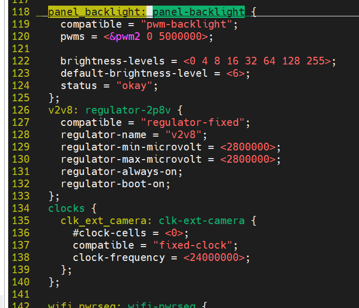 panel_backlight: panel-backlight { compatible = “pwm-backlight”; pwms = <&pwm2 0 5000000>; brightness-levels = <0 4 8 16 32 64 128 255>; default-brightness-level = <6>; status = “okay”; }; 设置背光使用pwm2的第二个通道,PWM频率为200Hz。 设置背8级背光(0~7),分别为0、4、8、16、32、64、128、255对应占空比为0%、1.57%、3.13%、 6.27%、12.55%、25.1%、50.19%、100% 设置默认背光等级为7,也就是100%的亮度 //参考内核PWM文档 |