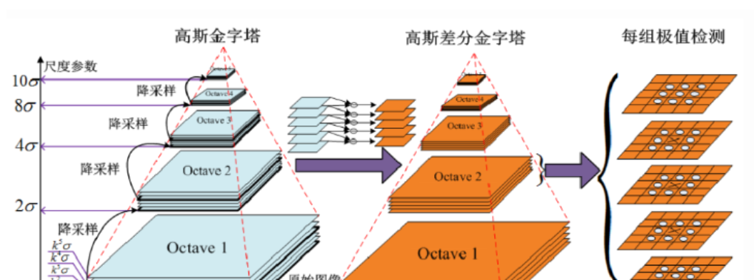 ①构建高斯尺度空间,产生不同尺度的高斯模糊图像。