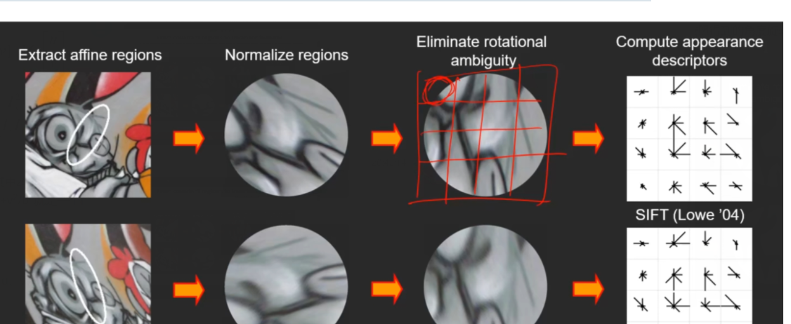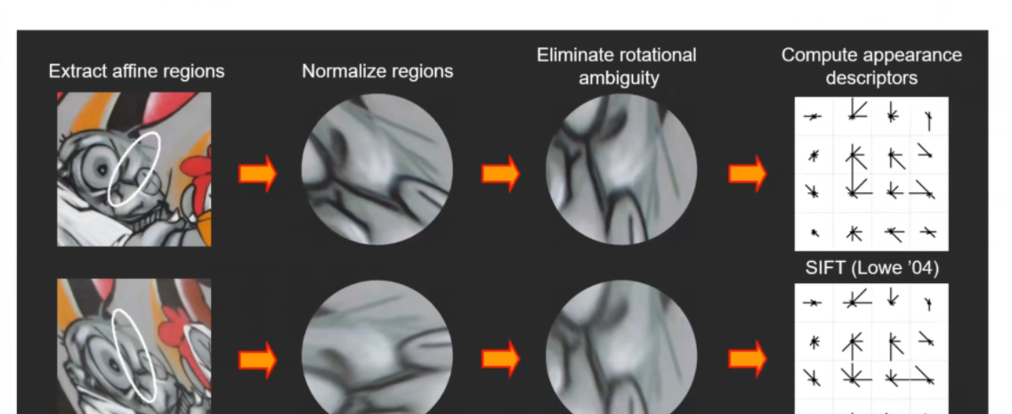可以看到针对于房屋这个例子,要比较尺度里面的内容是比较容易的,因为它没有经过视角变换,只有尺度的变换,也就是只做了放大放小的操作,里面的内容基本一致。但是看到涂鸦的这个例子是进行了视角变换的,那么想要比较里面的内容,首先的一个思想就是将这个尺度变为同等大小的圆,在比较里面的内容。