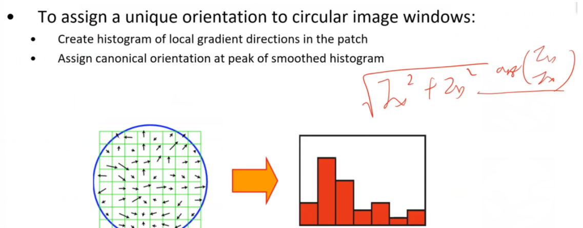 针对上述的角度问题,我们还需要对加了仿射变换的sift进一步进行扩展,使得其对于角度变换也具有协变性。具体怎样扩展可以看到上图,绿色的网格代表着图像上的每一个像素点,我们需要把每个像素点的梯度方向和梯度幅值都计算出来,然后绘制右边的梯度方向直方图。具体的绘制方法就是将横坐标制定为角度,范围为0-360°,将其按照45°一个格子进行量化,然后将每个像素点的梯度幅值投票到对应的梯度方向的直方图的格子里面去。将直方图绘制完之后,找到直方图里投票数最大对应的角度值,这也是图像梯度变换最大的方向,然后将图像的这个方向按照得到的角度旋转至0°的位置。